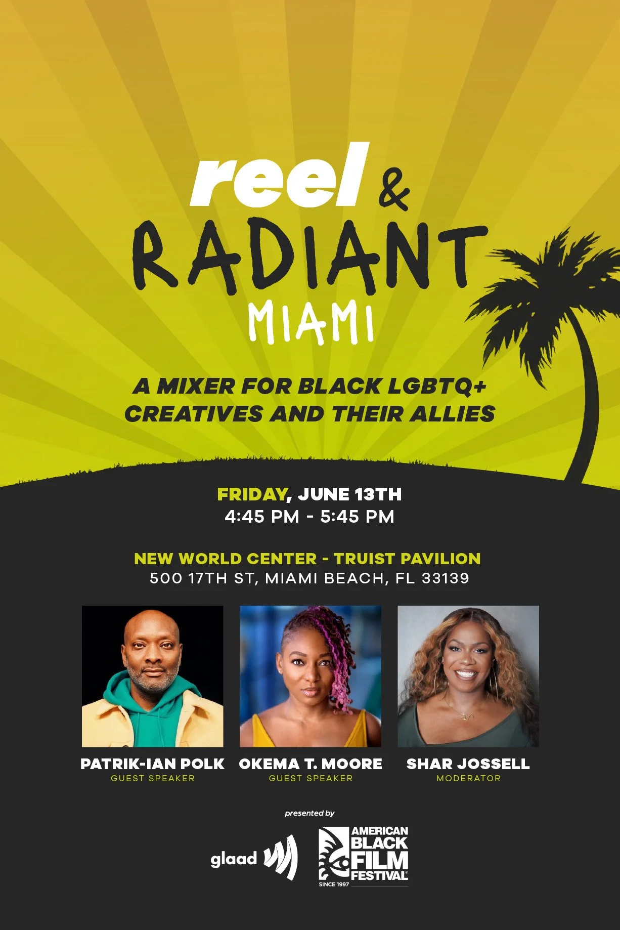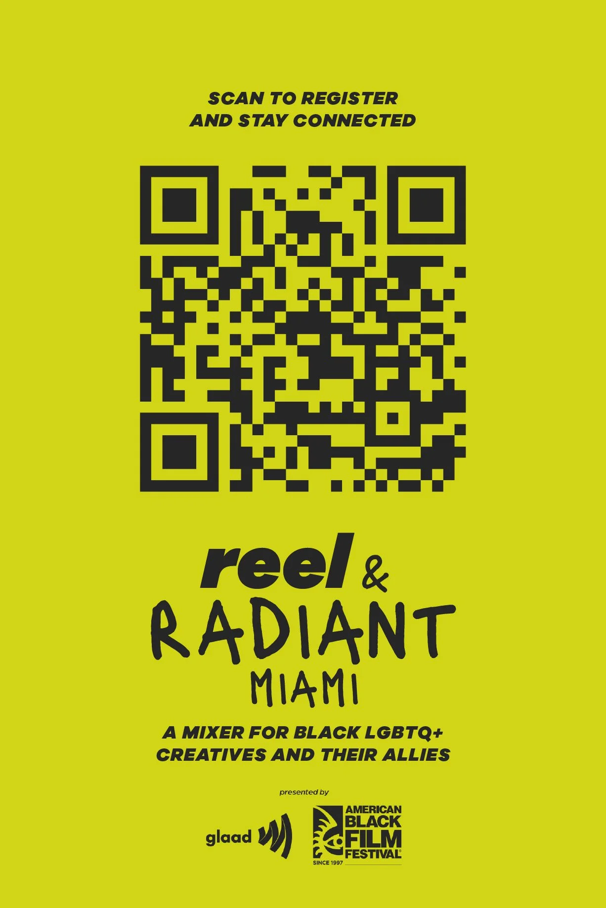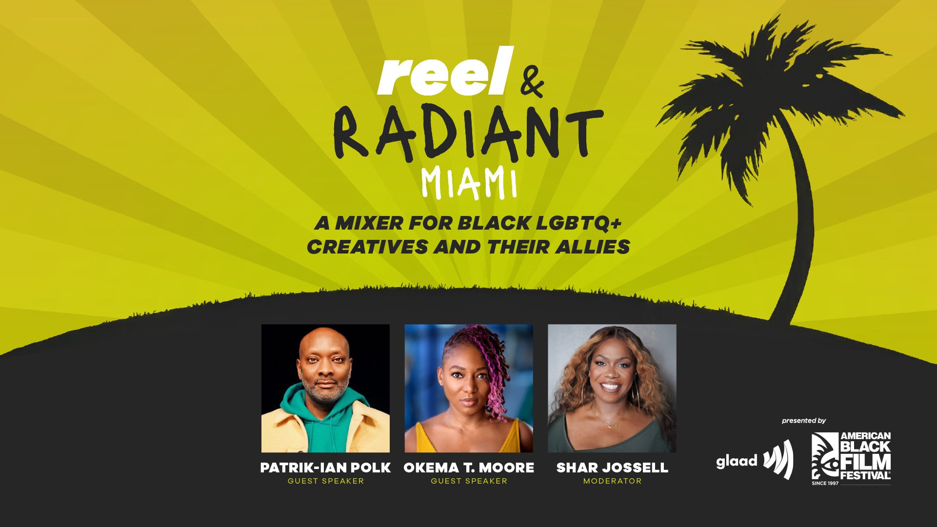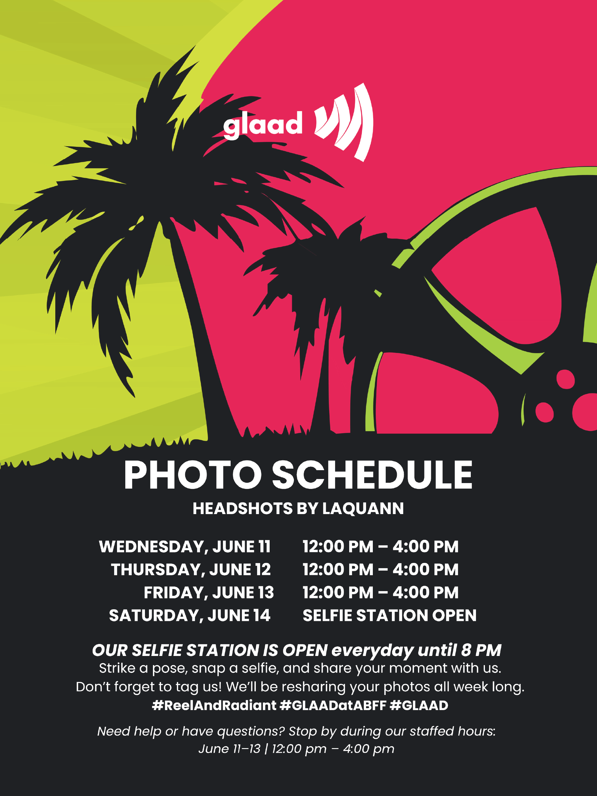 Reel & Radiant: Miami was a custom photo booth and visual activation created for the American Black Film Festival in partnership with GLAAD. I designed the event graphics and built the physical set, while photographing attendees throughout the activation. The booth served as both a portrait experience and an outreach moment — inviting festivalgoers to engage with GLAAD’s work and directing them toward a screening and panel taking place during the festival.