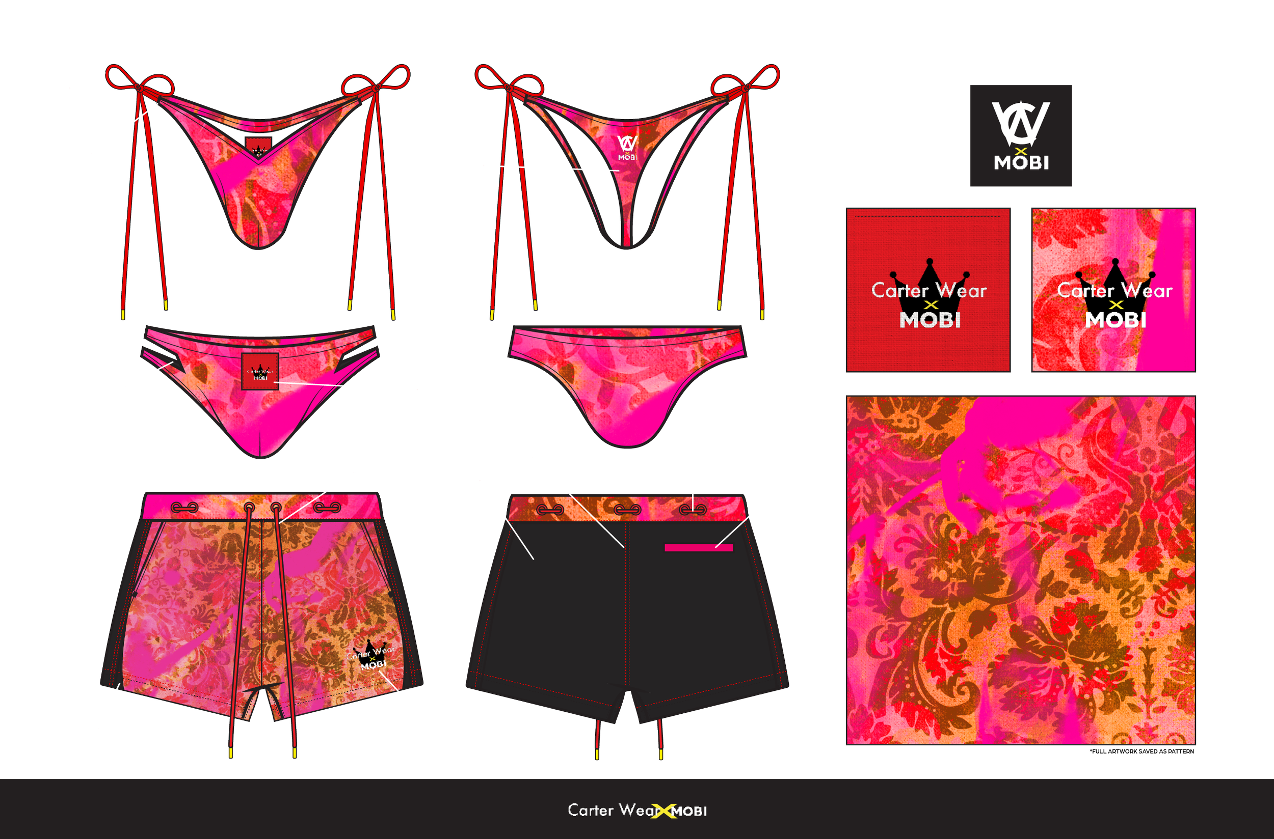 Carter Wear x MOBI was a collaborative swim capsule designed for MOBI in partnership with Carter Wear. I led the project from concept through execution — designing the silhouettes, prints, cuts, and specifications, and producing full tech packs for the collection. I also directed the campaign, casting and photographing the models to ensure the visual language of the shoot aligned with the identity and intention of the garments.